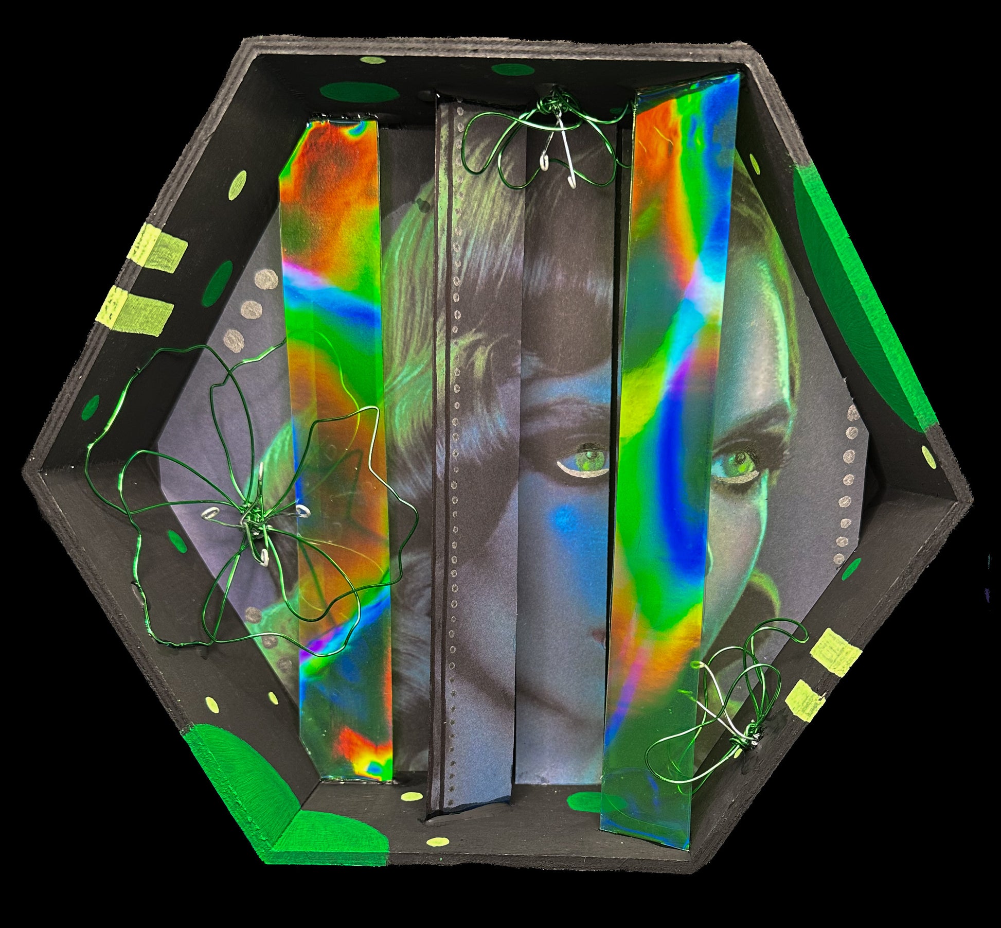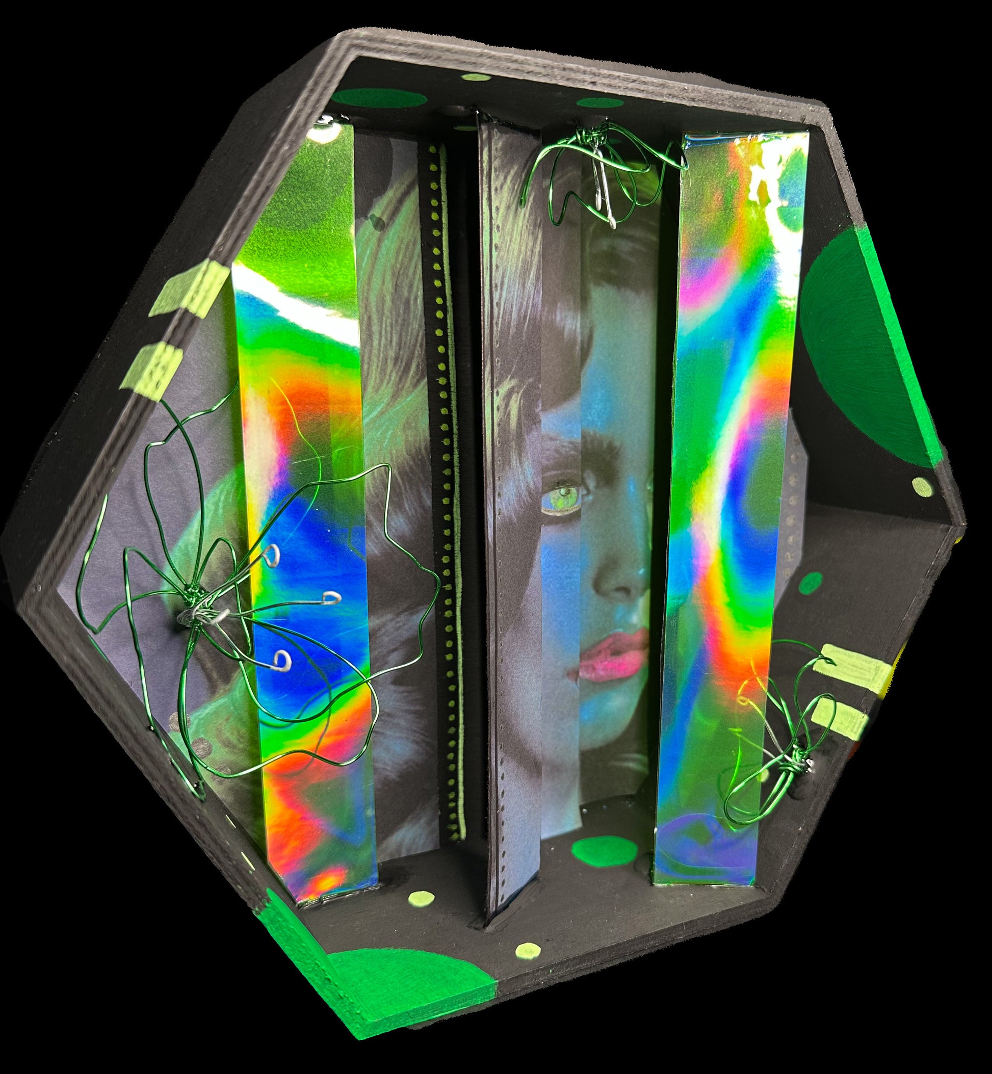 8” x 7.5” shadow box. Acrylic, paper, and wire on wood.