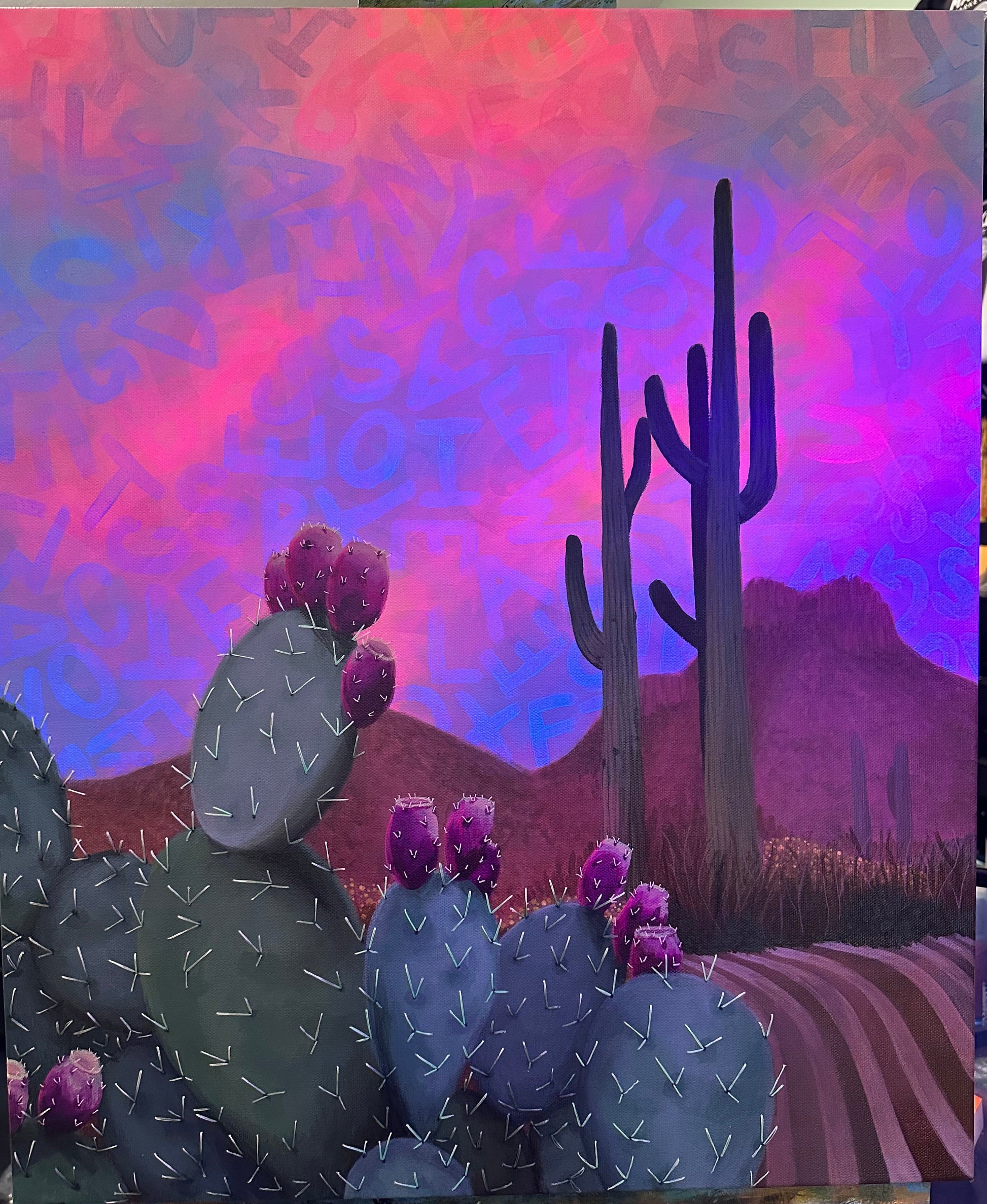 A cotton candy sunset filled with hidden language over a desert scene. More details revealed when viewed with blacklight. Cactus spines on the prickly pear are hand embroidered.